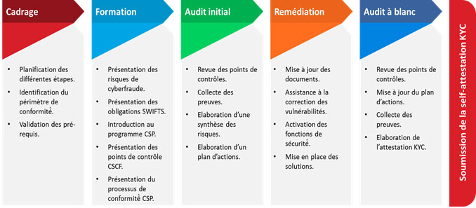 Convaincue de la nécessité de mise en conformité rapide par rapport aux différentes exigences du CSP, HtagHub Group propose une démarche adaptée tenant compte des spécificités de chaque banque.