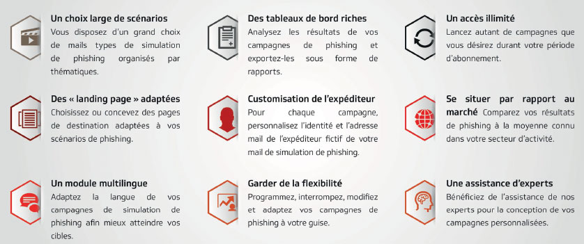 Il est essentiel dans un programme de sensibilisation, de pouvoir évaluer les points de vulnérabilités de vos utilisateurs par la pratique. Cela vous donne une meilleur lecture des zones de risques SSI liées au facteur humain au sein de votre organisme et vous permet de proposer des actions de sensibilisation plus adaptées et mieux ciblées afin de réduire le risque. Nos scénarios très réalistes de simulations d’attaques de phishing vous permettent d’évaluer le niveau de connaissances de vos utilisateurs en matière de phishing et leur vulnérabilité face à une menace réelle.